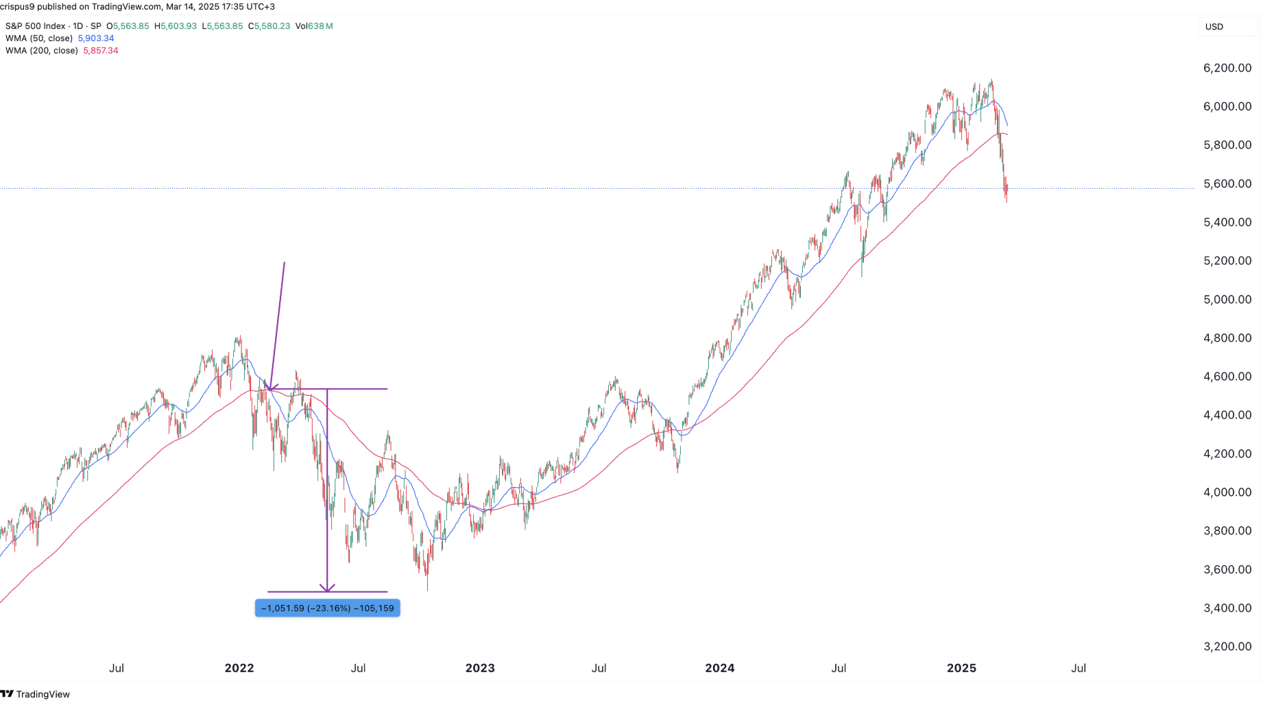 目前,S&P 500指數面臨著潛在的死亡交叉風險,其50天加權移動平均線(WMA)與200天加權移動平均線的距離正在急速縮小。數據顯示,50天WMA目前位於5,900點,而200天WMA則為5,857點。若發生交叉,根據歷史數據顯示,市場可能進一步下跌。