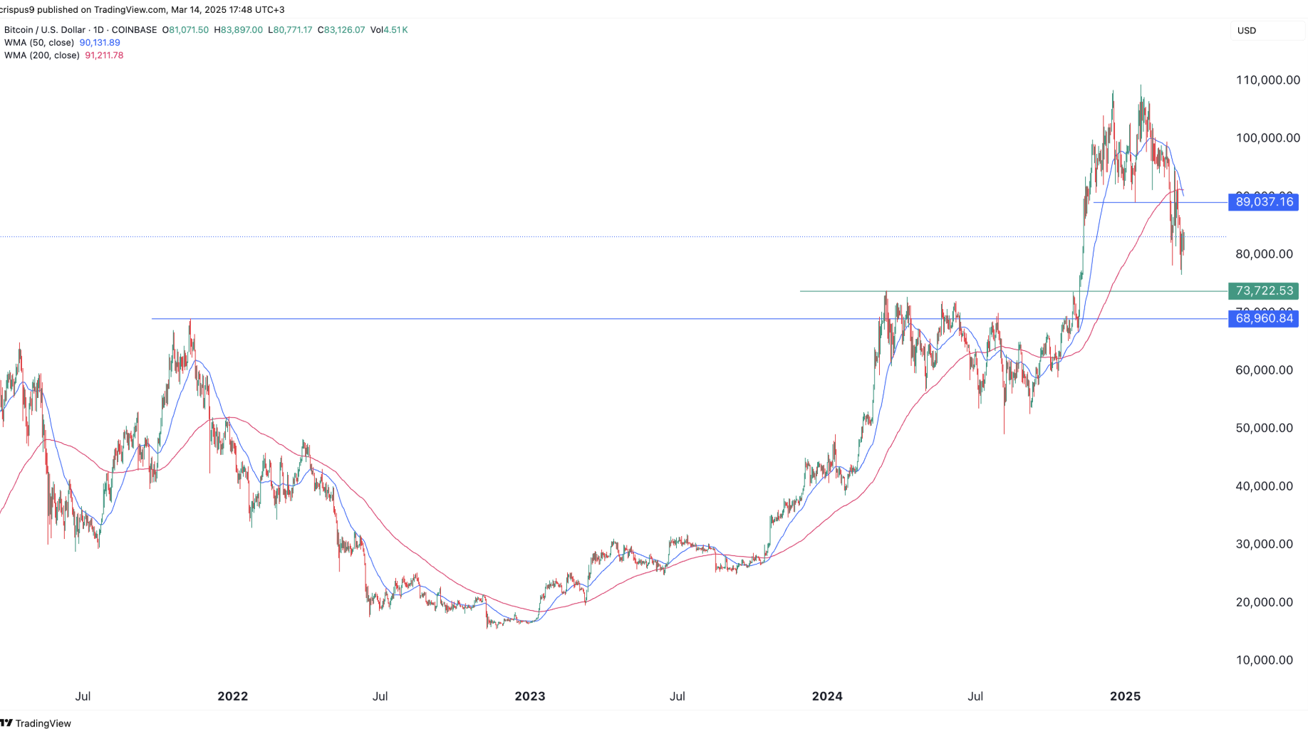 根據比特幣的價格走勢,死亡交叉發生在比特幣跌破89,000美元這一關鍵支撐位後,這個價位同時也是雙頂形態的頸線位置(頸線是技術分析中決定突破點或重回支撐的位置)。雙頂形態是技術分析中最具看跌意味的形態之一,暗示價格可能進一步走低。