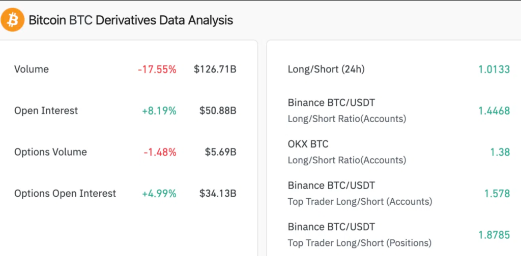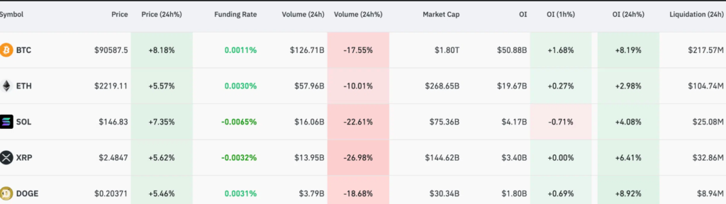 從衍生品數據得知,BTC與ETH在最近24小時內分別記錄了$218M與$105M的市場清算。然而,相比現貨交易量的下降,總未平倉合約(Open Interest, OI)卻同步上漲,表明市場參與者對未來價格持積極態度。