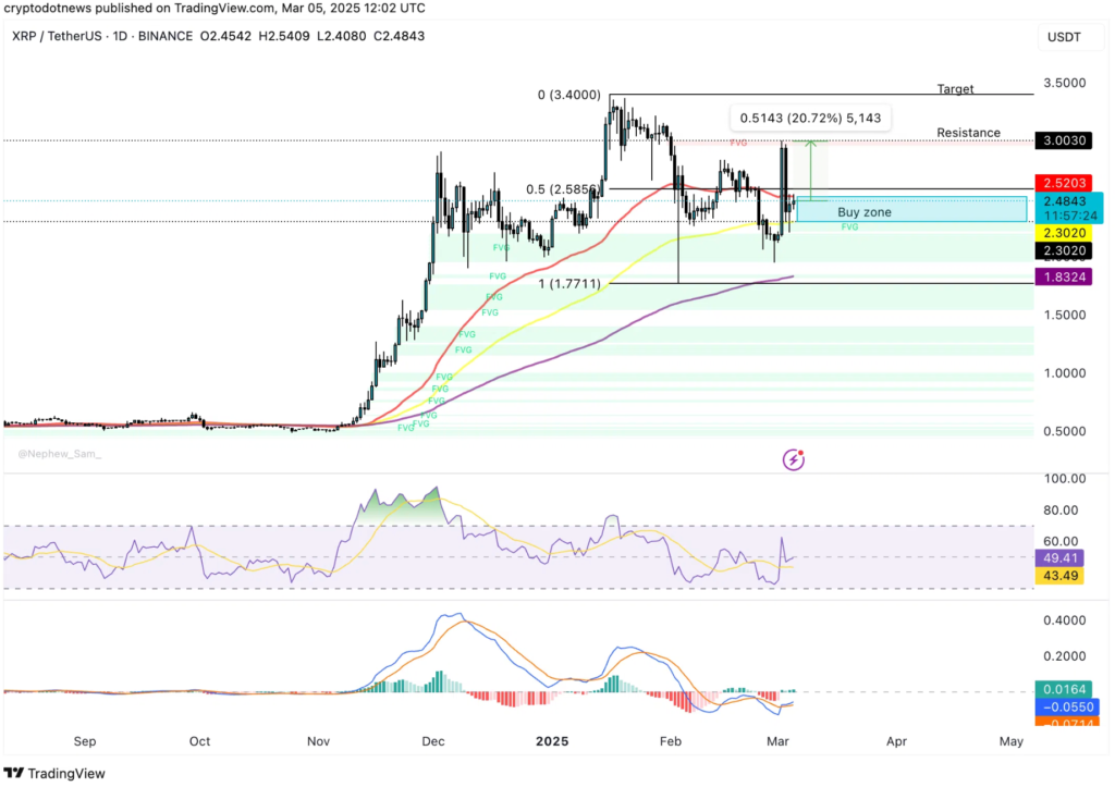 從技術圖表來看,XRP/USDT的日線價格區間介於50日與100日指數移動平均線(EMA)之間,買入區域為$2.3020–$2.5203,目標價位於$3.40,其主要阻力在$3.0030。技術指標也支持看漲趨勢,RSI接近中立值49,且MACD顯示出積極的上升勢頭。