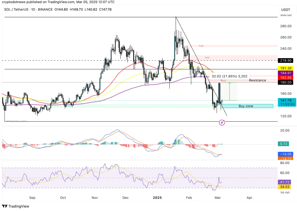 Solana目前交易於$147.78,長期支持區域接近$150。若成功突破,可能向$180阻力位發起挑戰。Solana的50日、100日與200日EMA分別位於$182.85、$191.30與$184.91,是後續反彈的重要指標。技術分析顯示SOL價格趨勢具有良好的動能,適合尋求短期收益的投資者。