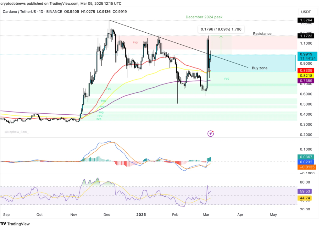 Cardano價格現報$0.9973,其買入區域介於$0.9837–$0.8235之間,重要阻力位則在$1.1723附近,預計可實現18%的上漲。Cardano正在其Fair Value Gap的上邊界運行,並且技術指標(RSI與MACD)均顯示看漲信號。